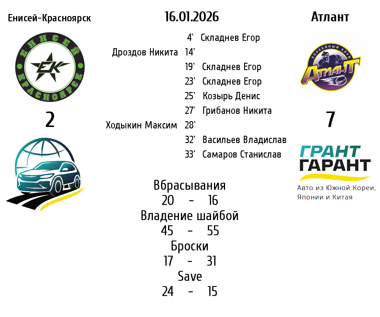 Красноярская федерация хоккея | Атлант | Енисей-Красноярск | 7 : 2 | Скачать отчетИзображение |