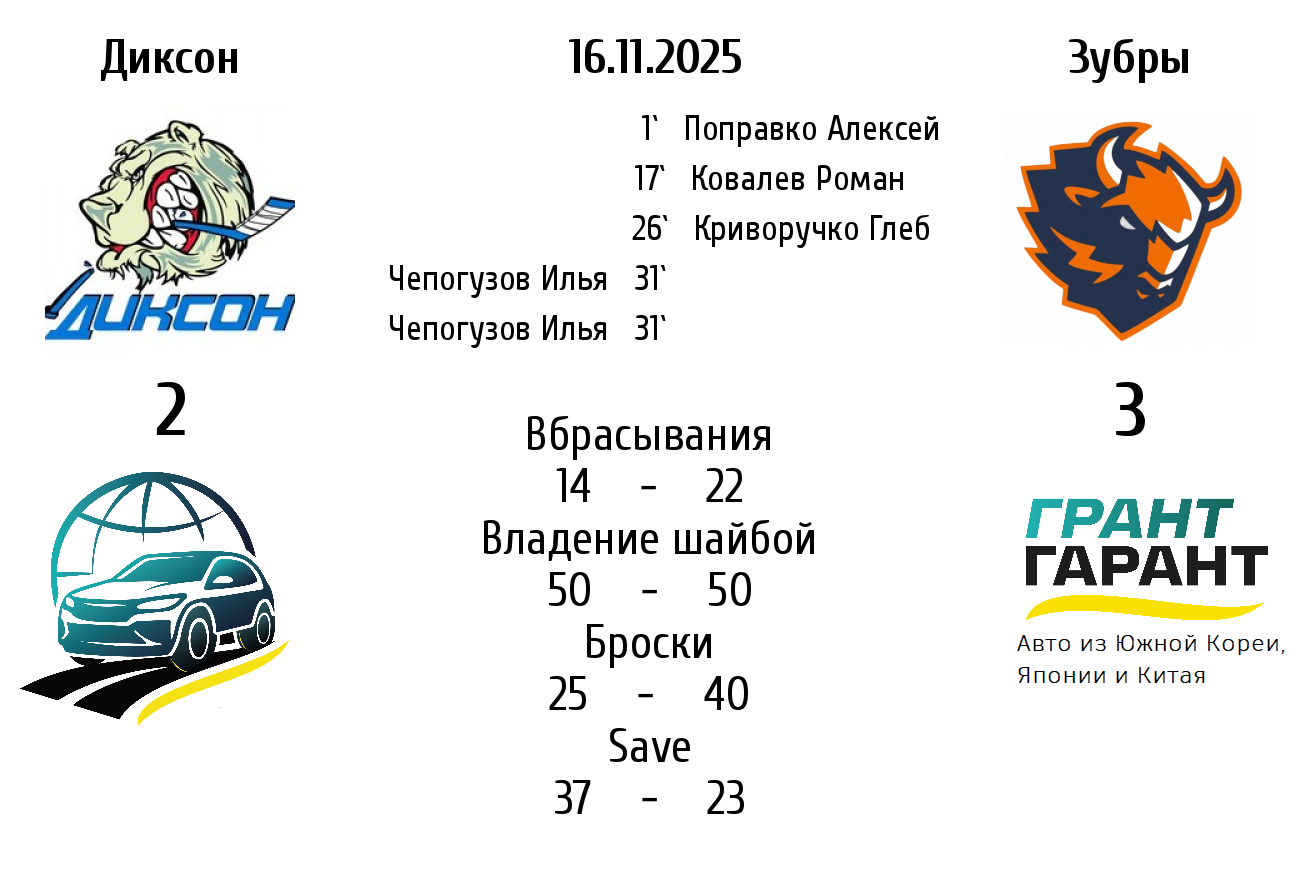 Красноярская федерация хоккея | Диксон | Зубры | 2 : 3 | Скачать отчетИзображение |