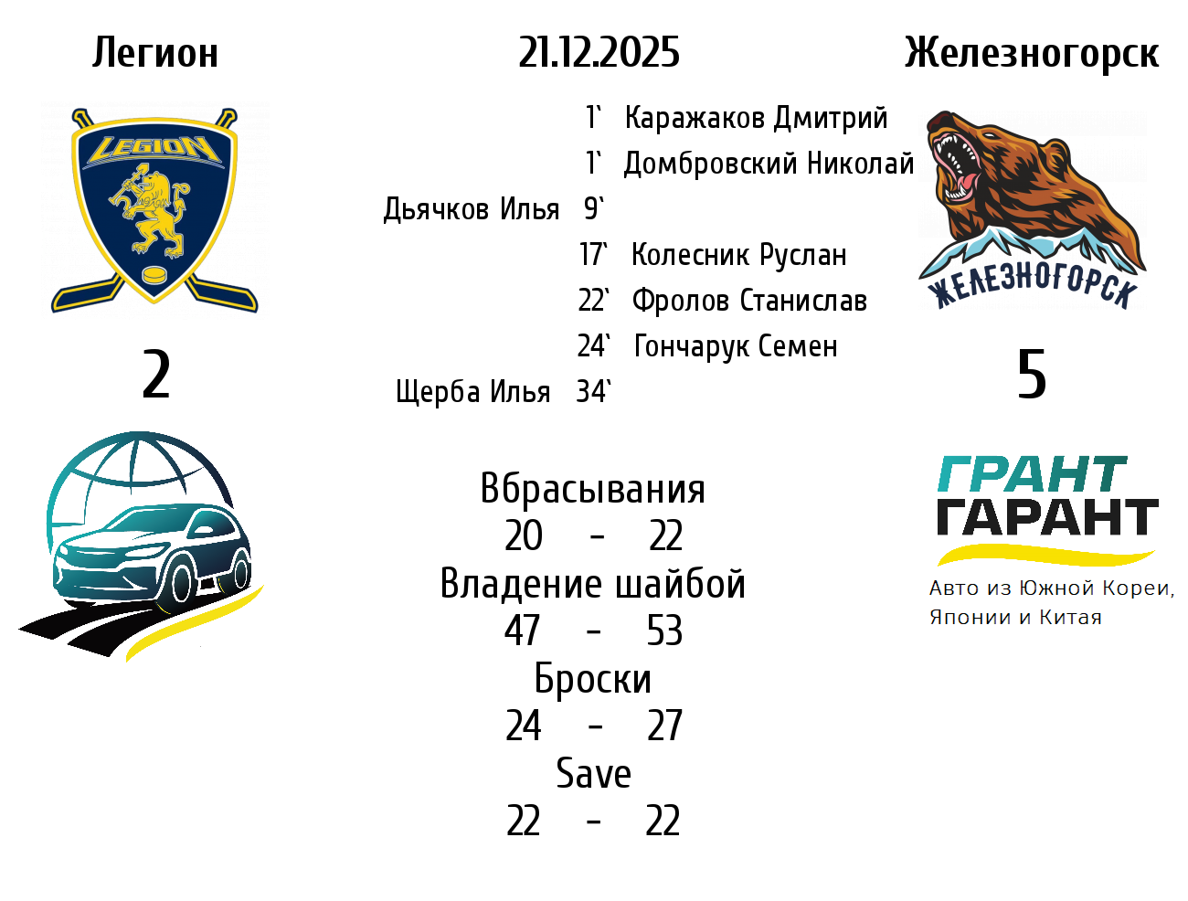 Красноярская федерация хоккея | ZELEN | Легион | 5 : 2 | Скачать отчетИзображение |
