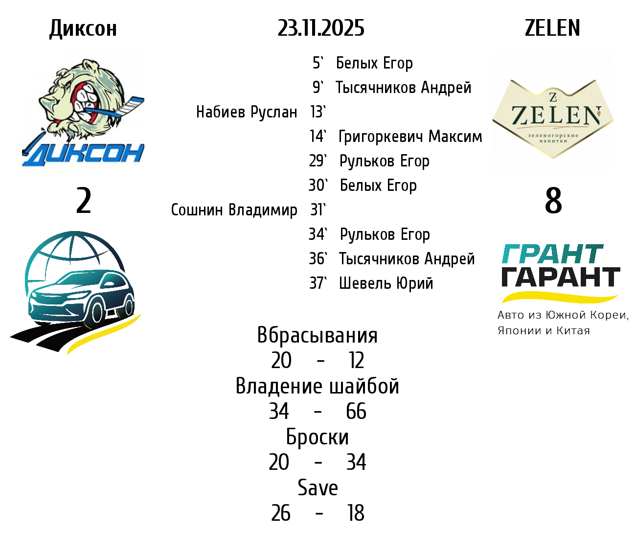 Красноярская федерация хоккея | ZELEN | Диксон | 8 : 2 | Скачать отчетИзображение |